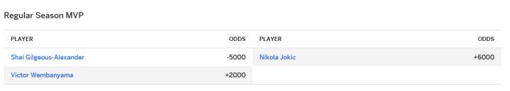 虎扑04月09日讯今日ESPN官方更新了常规赛MVP的赔率榜单,雷霆球员谢伊-吉尔杰斯-亚历山大继续以-5000的赔率位居榜首,马刺球员维克托-文班亚马+2000位居次席,掘金球员约基奇以+6000的赔率排在第三位。