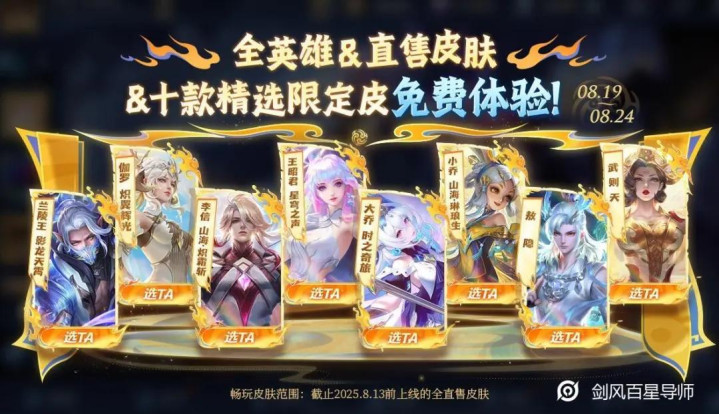 同期,也就是 8 月 19 日至 24 日,还有全英雄和直售皮肤限免活动。敖隐、武则天这些英雄都能免费用,直售皮肤限的是 2024 年 8 月 13 日前上线的,还有精选限定皮肤,排位赛里也能用。