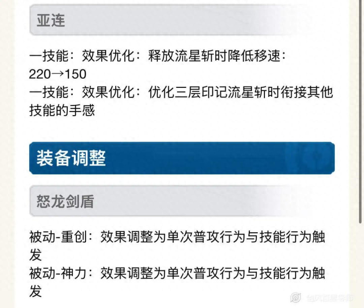 装备方面,怒龙剑盾的被动触发机制改了,现在单次普攻行为只能触发一次被动,不像之前部分射手 3 次普攻算一次行为能多次触发,同时明确了技能可以触发被动。