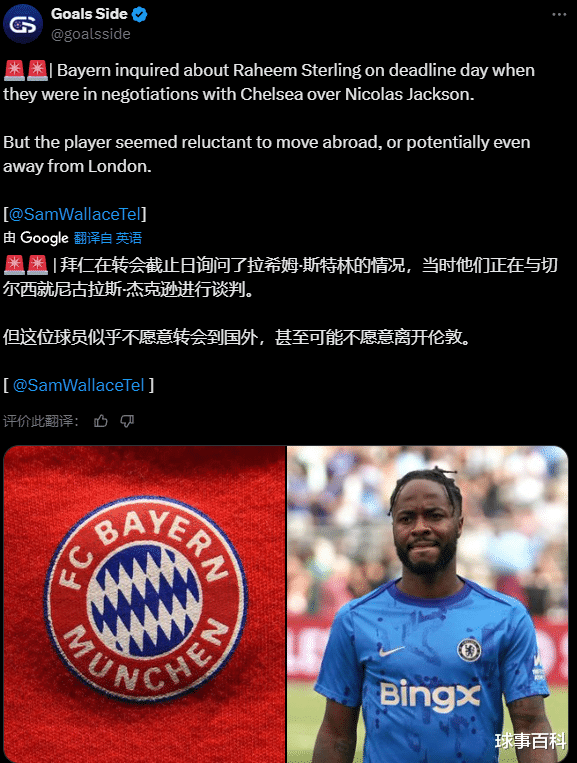据《每日电讯报》记者Sam Wallace透露,拜仁在转会截止日当天询问了斯特林的情况,但他本人不愿意出国踢球。对于斯特林婉拒拜仁的行为,不少蓝军球迷都很吃惊。因为拜仁可是德甲班霸,去了拜仁意味着斯特林有机会征战欧冠比赛,这对于他找回状态,重返舞台中心大有益处。