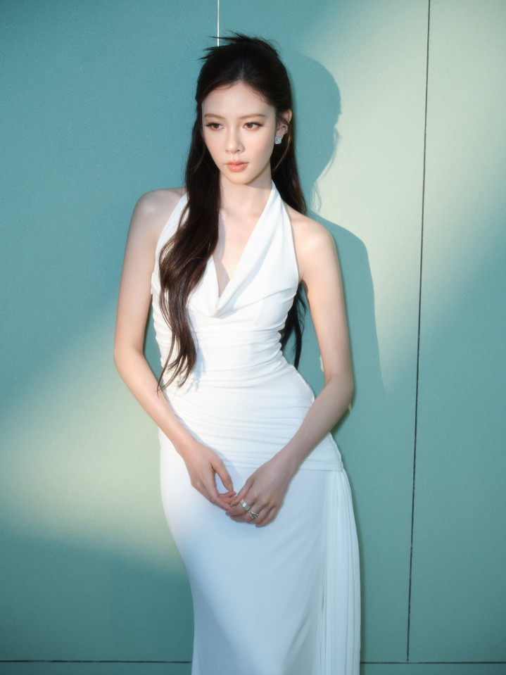 宋妍霏白裙化形冷焰天鹅!挂脖系带锁尽薄背风光,转身时冰棱折光漫屏