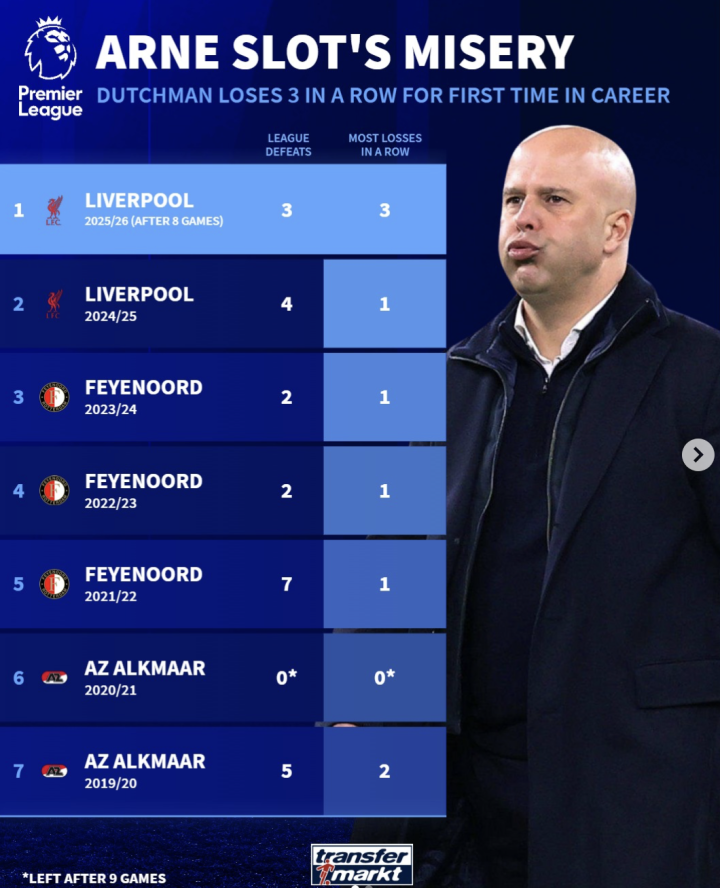本轮利物浦输给曼联后, 斯洛特执教生涯首次遭遇联赛三连败