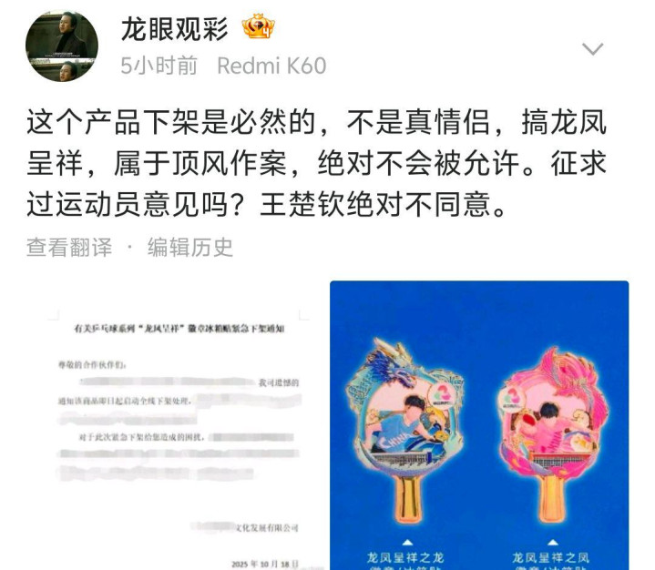 国乒选手孙颖莎和王楚钦前一段时间被商家印制了龙凤呈祥的冰箱贴,遭到球迷的投诉被下架。球迷之所以投诉这个冰箱贴,主要是觉着商家有些炒CP组合的企图。体坛记者贺晓龙认为,这个龙凤呈祥的冰箱贴如果不下架,肯定会大卖。在国庆节期间,很多球迷还托关系求他搞北京大满贯赛事混双决赛的门票。