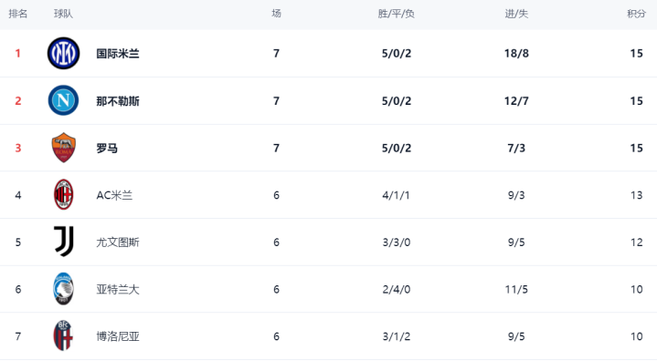 在积分榜上,前3的球队积分相同。国际米兰5胜2平拿到15分,升到了榜首位置。输球的那不勒斯也是15分,但净胜球只有5个,只能排名第2。罗马也是15分,但净胜球只有4个,排名第3。AC米兰13分排名第4。第5的是尤文图斯,3胜3平保持不败,拿到12分。亚特兰大也是不败战绩,2胜4平,拿到10分排名第6。博洛尼亚和萨索洛同样积10分,排名第7和第8。